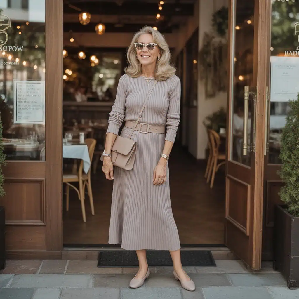 Embracing a knit dress with a belted waist is a brilliant choice that exudes both comfort and style. The soft, stretchy fabric of the dress hugs the body in a flattering way, accentuating the waistline while offering ample flexibility for movement. The elongating effect of the belt creates a sophisticated silhouette, drawing attention to your natural curves. Paired with elegant ballet flats, this outfit strikes a perfect balance between chic and cozy. Ballet flats not only lend comfort for all-day wear but also keep the look polished and youthful. Complementing the ensemble with a leather crossbody bag and minimal accessories, like small hoop earrings, ensures it feels modern and slightly playful. This combination effortlessly radiates confidence, making it a perfect go-to for any occasion.