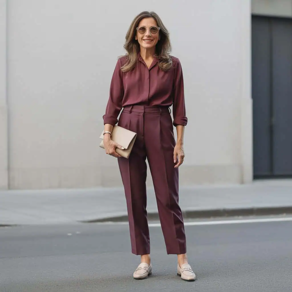 Shoes have the power to anchor a monochrome outfit and make a bold statement on their own. Opting for rose gold kitten heels adds a delightful twist to your brown ensemble, effortlessly elevating your look while being comfortable for any occasion. The soft shine of the metal plays beautifully against the rich brown tones of your attire. This contrast not only draws attention to the feet but also enhances the overall elegance of the outfit. Pairing the heels with a fitted blouse and flared trousers creates a harmonious silhouette, ensuring that you feel as fabulous as you look—because style knows no age limits!