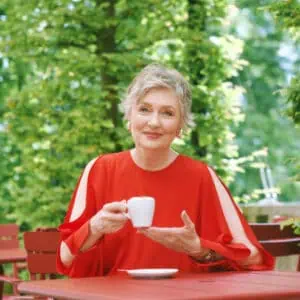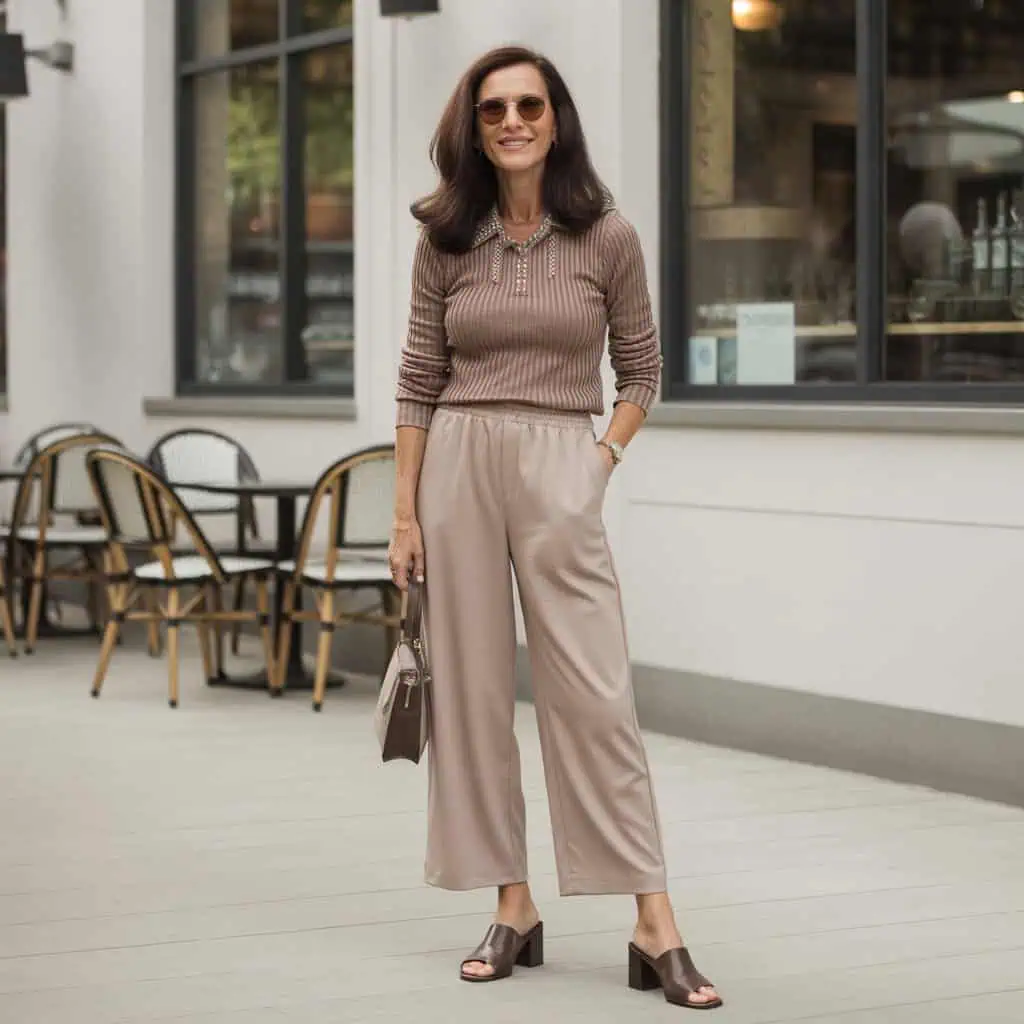 Pull-on wide-leg pants are an elegant yet comfortable option for women over 60, offering ease of wear without sacrificing polish. A beige pair styled with a polished brown knit top featuring refined details creates a balanced, sophisticated look. Block-heel mules add just the right amount of lift while remaining easy to walk in, keeping the outfit both stylish and practical. A structured handbag enhances the ensemble’s modern feel, while minimalist jewelry and chic sunglasses bring understated elegance. Perfect against the backdrop of a sleek bistro, this look proves that comfort and style can coexist beautifully for any occasion.