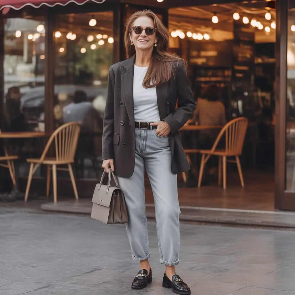 Straight-leg jeans bring a refined casual elegance, especially when styled in a neutral tone with a sleek belt for definition. A crisp white top tucked neatly beneath a tailored wool blazer adds structure and timeless sophistication, perfect for café outings or city strolls. Black loafers offer a classic touch of comfort and polish, balancing the outfit with ease. The structured leather handbag enhances the look with function and luxury, while subtle stud earrings and cat-eye sunglasses provide just the right amount of minimal glamour. With warm café lighting as the backdrop, this ensemble captures a poised yet approachable charm.