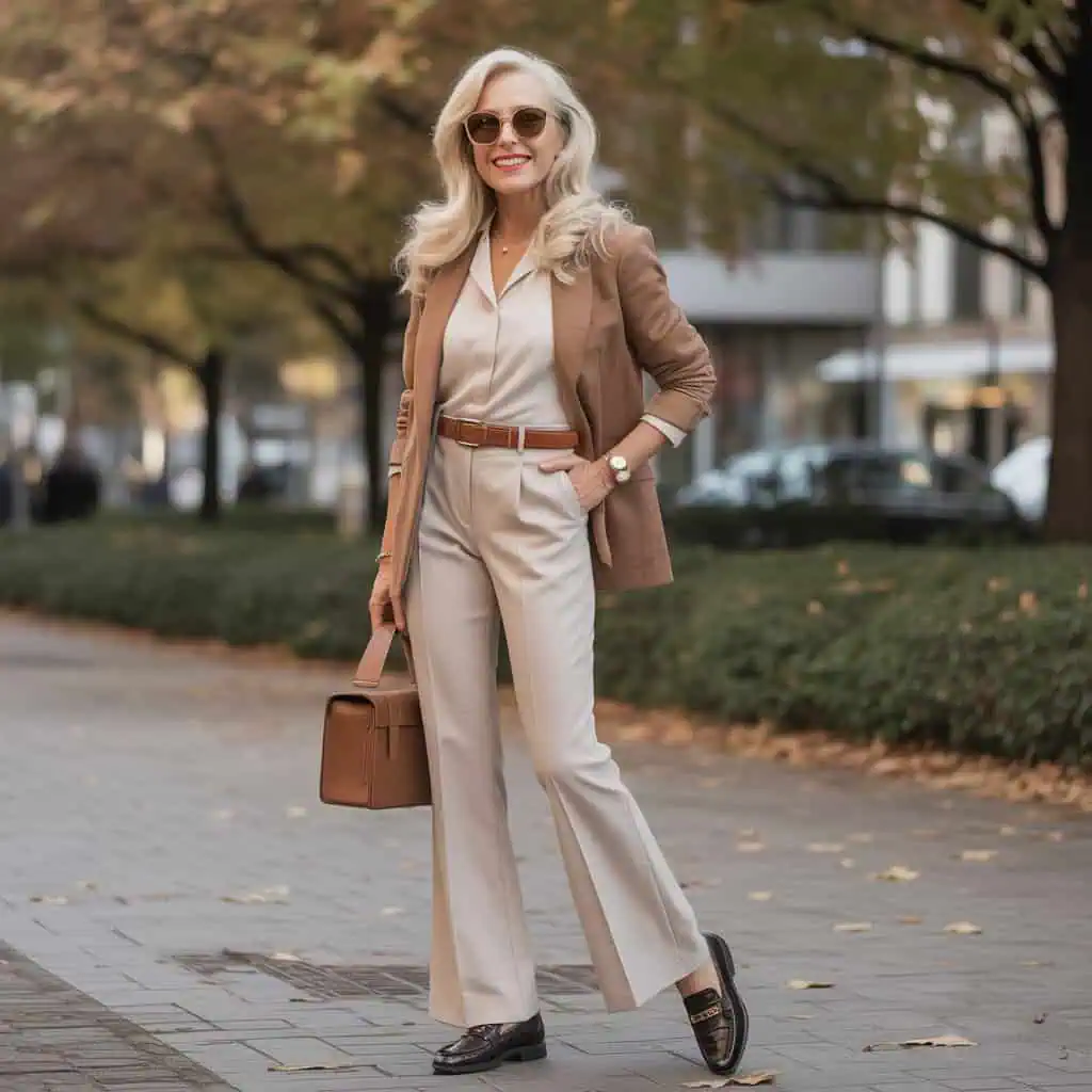 High-waisted pleated trousers are an ageless staple that perfectly blends comfort with chic style. The high waist elongates the legs and creates a defined waistline, offering a flattering fit for women over 60. Choosing neutral autumn shades like taupe or olive complements a variety of tops while ensuring you’re aligned with the season’s palette. Pairing these trousers with a fitted turtleneck tucked in creates a streamlined and sophisticated look. Polished loafers provide comfort without sacrificing style, ideal for long days out. A structured tote bag is both functional and stylish, while aviator sunglasses inject a trendy vibe. This outfit reflects effortless elegance, making it suitable for any occasion.