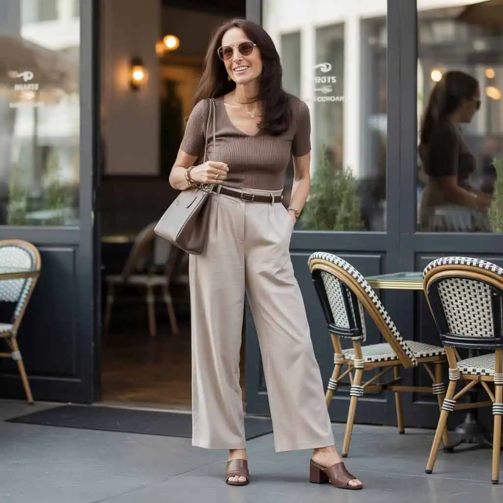 Combining a polished knit top with pull-on wide-leg pants encapsulates a sophisticated yet relaxed approach. The knit top hugs your figure without feeling restrictive, while its elegant details make it eye-catching. Pairing it with wide-leg pants enhances movement and brings a sense of ease to the outfit. The block heel mules offer stability and a lift without compromising comfort, making them a practical choice for longer outings. Accessorize with a sleek handbag and understated jewelry, creating a chic, modern look that showcases both style and comfort—ideal for daytime adventures or casual gatherings.