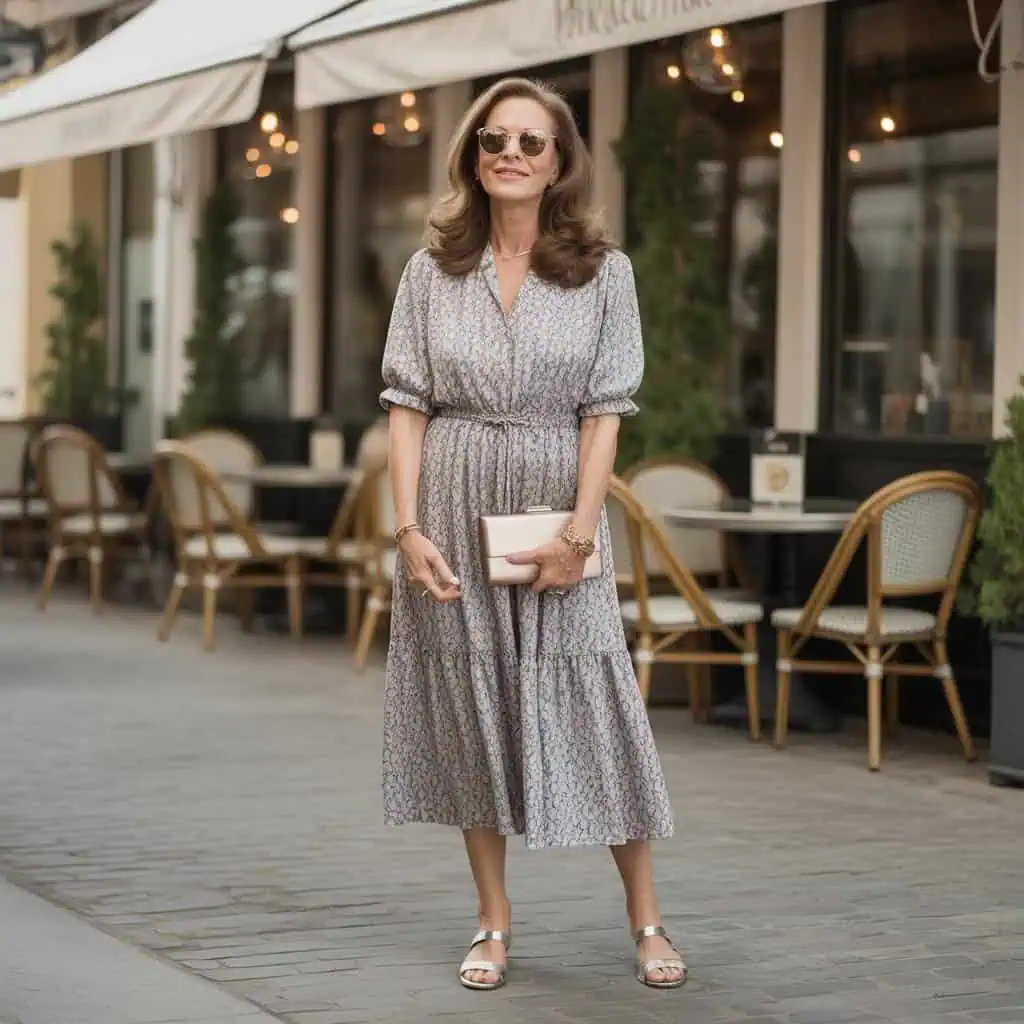 Embracing effortless elegance is easy with a tie-waist midi dress paired with woven slides. The dress’s tie accent highlights your waist while providing a relaxed fit that flatters various body shapes, making it perfect for both casual outings and more polished events. The woven slides add just the right touch of bohemian flair without sacrificing comfort, ideal for long days spent socializing or running errands. Paired with a stylish handbag and oversized sunglasses, this look exudes confidence and charm, embodying a vibe that shows age has nothing to do with style.