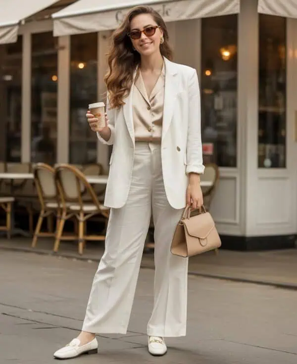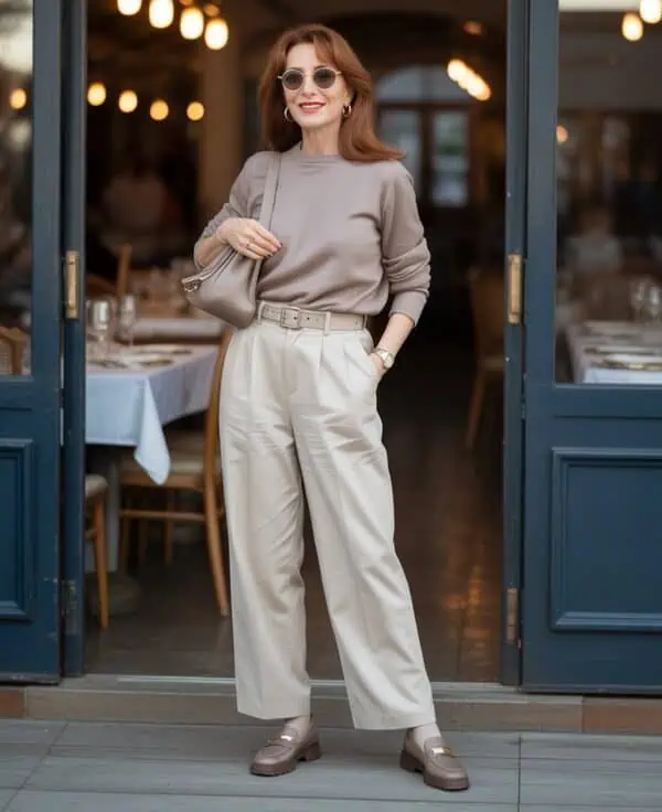 Boxy cropped jackets are an instant style trap for the over-60 crowd, as they can often give a shapeless silhouette. Instead, focus on pieces that offer a bit of shape—think tailored blazers or slightly cropped jackets with a more defined waist. Pairing a well-fitted blouse underneath creates a streamlined effect, making for a polished look. The white button-up brings a classic feel, while straight-leg beige trousers lengthen the legs and balance out the proportions. Finishing with loafers adds a touch of sophistication without sacrificing comfort; the key is to select styles that enhance rather than overwhelm your figure, fostering a chic, yet ageless appeal.