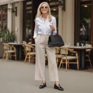 Pointed flats are a chic alternative to heels, offering the elongating effect without compromising comfort, a perfect choice for petite women. When styled with tailored pieces like a navy blazer and cream trousers, they create a harmonious, polished look. The combination is smart yet approachable, allowing for an easy transition from day to evening. Pointed-toe shoes naturally draw the eye forward, visually extending the legs and adding sophistication to your frame. Modern accessories like structured handbags and chic sunglasses complete the outfit, ensuring you stand out with confidence and a touch of elegance in any setting.