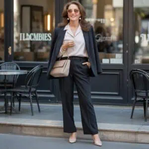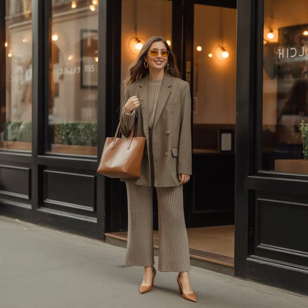 Turning up the charm, a tailored blazer worn over a cozy knit set is a winter wardrobe hero. This outfit embodies the essence of quiet luxury—smart yet relaxed. The structured blazer defines your silhouette and adds a polished touch, while the soft knit maintains comfort, making it ideal for those chilly days when you want to look put-together without sacrificing warmth. The complementary mix of textures is visually engaging, and adding mid-heel pumps further elevates this ensemble. Finish it off with gold hoops and a sleek tote for an effortlessly chic look that transitions seamlessly from coffee runs to curated events.