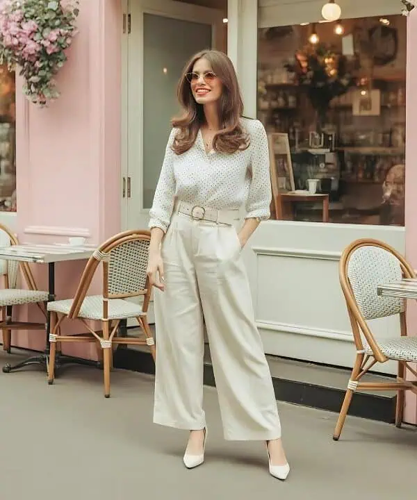 The appeal of classic heels is that they never go out of style, and they can instantly elevate any outfit. Cream kitten-heel pumps strike the perfect balance between comfort and sophistication, offering a chic lift without sacrificing ease of wear. Pairing them with a luxurious cream silk blouse and tailored black trousers creates a striking monochromatic look, perfect for making a standout impression. Accessorizing with oversized sunglasses and pearl earrings introduces a touch of timeless elegance, while the structured handbag adds refinement. This ensemble is not only eye-catching but exudes a graceful confidence, ensuring you’re fashion-forward while celebrating in comfort.