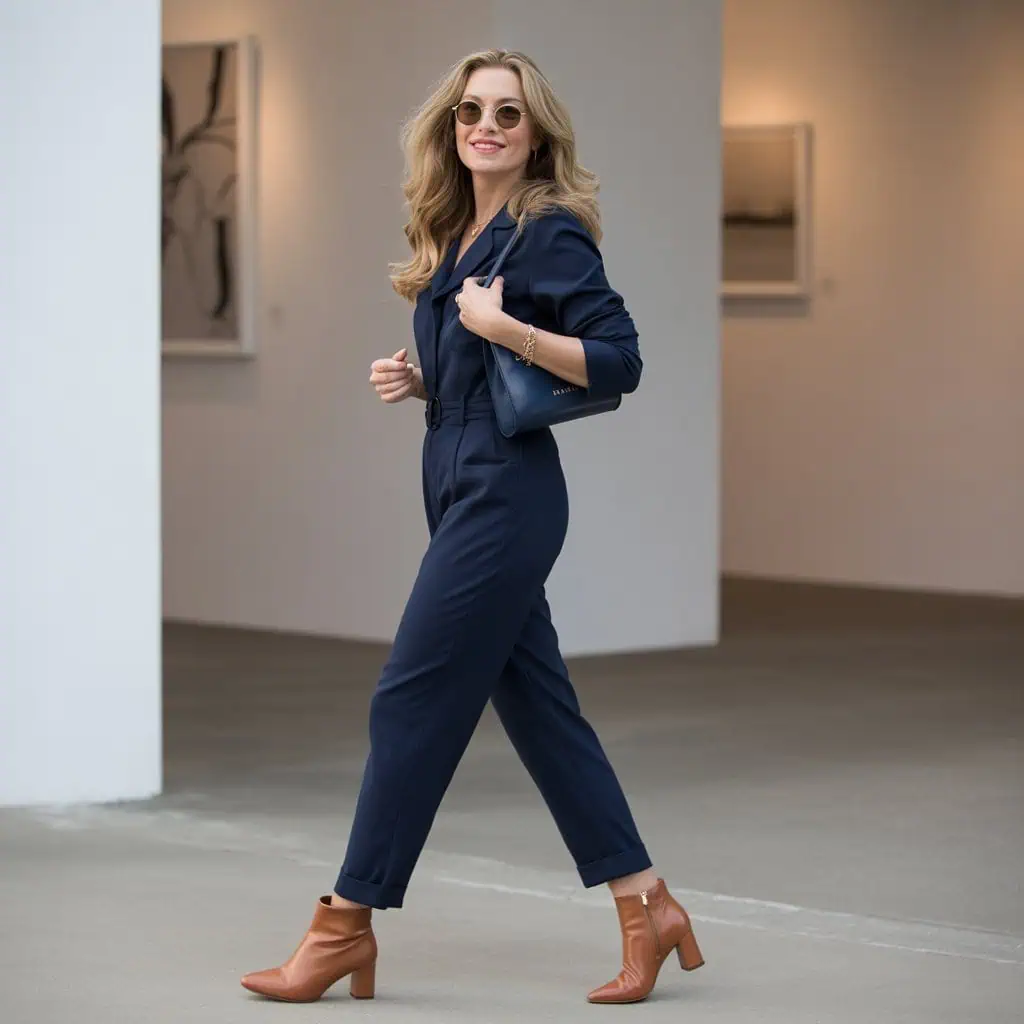 Investing in a tailored jumpsuit is a clever way to marry comfort with style, especially for holiday gatherings. The cinched waist flatters your silhouette, creating an effortlessly elegant look that still allows you to move and mingle freely. Opting for a rich navy hue elevates the outfit, enhancing its versatility while providing a lovely backdrop for accessorizing. Cognac heeled ankle boots add just the right amount of height, and a crossbody bag keeps things practical yet stylish. This one-piece wonder is perfect for all occasions, letting you channel confidence with minimal effort, making it a go-to choice for holiday festivities.