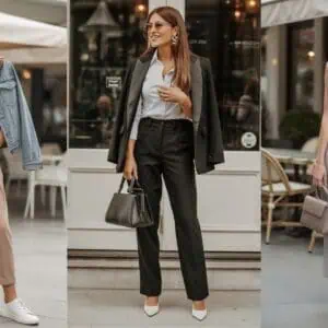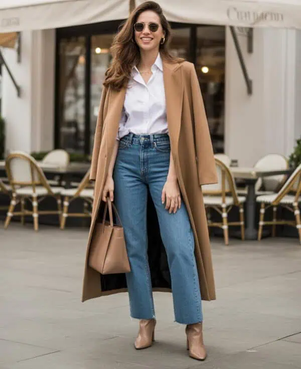Embracing minimal makeup and loose hair is key to achieving that effortlessly chic look reminiscent of classic romanticism. A teal silk blouse tucked into tailored black trousers offers a polished yet relaxed vibe, while keeping your overall appearance refined. The luxurious sheen of silk against the subdued pitch of the trousers creates a harmonious and sophisticated palette. Black suede ankle boots not only provide comfort but also add a hint of edge to the softness of the silk. Complementing with oversized sunglasses and a structured camel leather handbag creates balance in proportions and enhances your aura, reminding us that simplicity can be incredibly powerful in fashion.