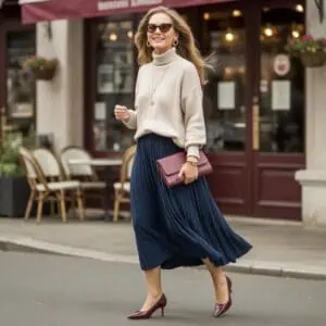 Muted plum plays beautifully with winter colors, offering warmth while remaining understated. By layering an oversized sweater over a delicate white midi slip dress, you create an intriguing interplay of softness and structure. The gentle waist definition of the dress adds femininity, while the relaxed fit of the sweater keeps it approachable. Tan leather slingback heels with a kitten heel enhance the outfit, allowing for movement without sacrificing style. Statement sunglasses and layered jewelry add a playful flair, making this look perfect for anything from casual gatherings to art exhibitions. The overall vibe radiates confidence and elegance, showcasing how to effortlessly embrace the winter season in style.