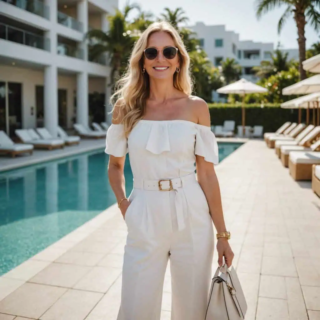 Imagine floating through a sun-dappled garden, embodying pure elegance. The white off-the-shoulder jumpsuit accentuates the collarbone and shoulders, and the jumpsuit’s clean lines and pristine color create a silhouette that elongates the body.