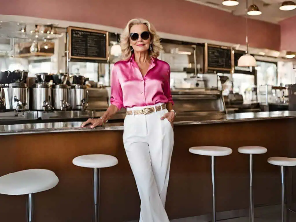 We are enchanted by the silky texture of the satin blouse and the way it catches the light. The pink hue adds a feminine touch, while the satin material offers a sophisticated sheen.