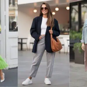 Chunky sneakers have had their moment, but sleek trainers are now redefining sporty elegance. A refined pair of minimalist white sneakers pairs beautifully with a fitted navy jumpsuit, pulling together an outfit that exudes modern sophistication. The cinched waist of the jumpsuit highlights your figure, while the clean lines of the trainers keep the look fresh and streamlined. Throw on a structured navy handbag and a stylish pair of sunglasses, and you’re ready to impress wherever you go. This update is perfect for those who appreciate comfort without sacrificing style, proving that you can look chic while on the move.