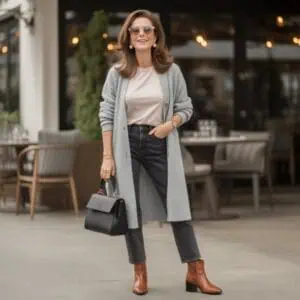 When it comes to effortless elegance, a well-fitted knit dress paired with a scarf takes center stage. The beauty of this look lies in its versatility and comfort. The olive-green hue of the dress, complemented by the light checkered scarf, creates a harmonious palette that’s visually appealing yet understated. The scarf not only adds a pop of texture but also serves as an eye-catching accessory, drawing the gaze upwards toward the face. Taupe leather ankle boots ground the outfit, while a structured handbag offers an air of sophistication. Delicate gold jewelry enhances the look without overwhelming it, achieving that perfect balance between comfort and style. This outfit not only makes you feel great but also leaves a lasting impression, showcasing your ability to look chic without sacrificing comfort.