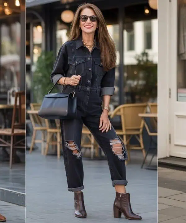 Revisit nautical nostalgia with a striped top and denim overalls. The classic stripes evoke a sense of maritime chic, the denim overalls bring a touch of youthful nostalgia, and together, they create a balanced look that’s fun and sophisticated while providing a flattering fit.