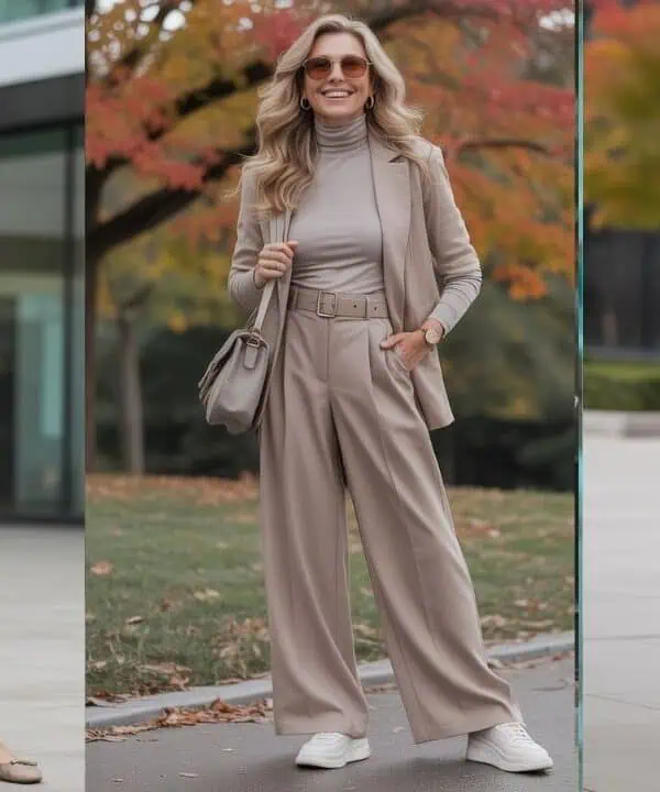 Wearing a neutral high-neck sweater with wide stripes embraces modern minimalism. The high-neck design adds a hint of sophistication, while the wide stripes create a bold, contemporary look.