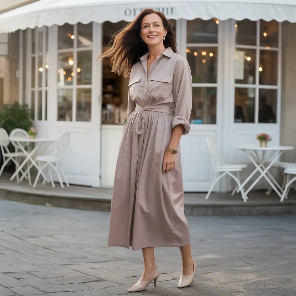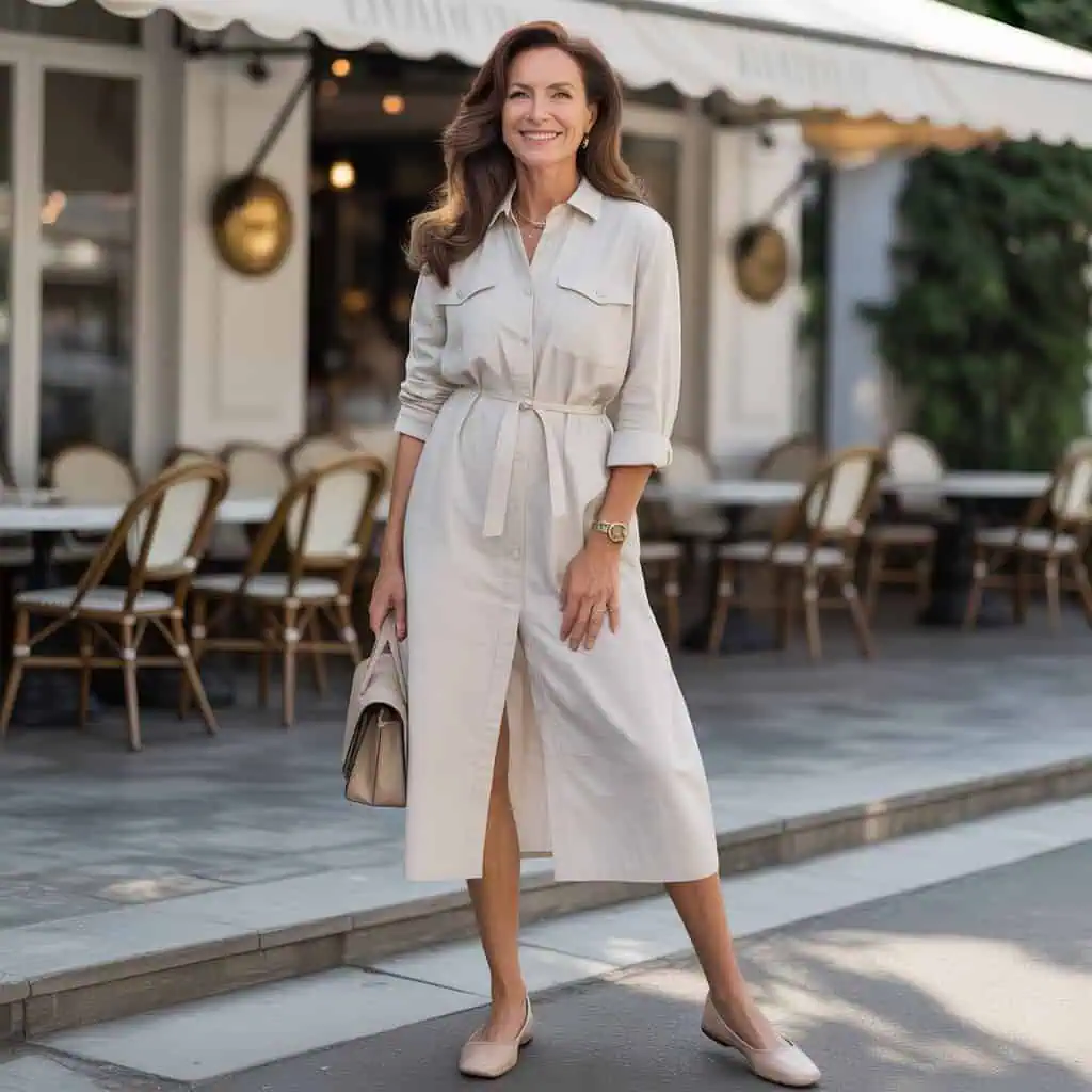 Perfect for embodying effortless elegance, the luxe linen shirt dress is a timeless silhouette that flatters all figures, especially after 50. Its lightweight fabric drapes beautifully, making it an ideal choice for warmer days while still offering ample coverage. The cinched waist creates a defined shape, accentuating your curves without compromising comfort. A soft cream color radiates sophistication and pairs wonderfully with nude ballet flats, elongating your legs. Completing the look with a chic handbag adds a polished touch that elevates your entire outfit, making it suitable for both casual outings and more refined events.