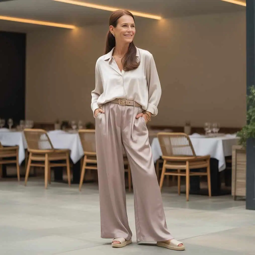 Silky wide-leg trousers paired with a relaxed silk blouse create an ensemble that perfectly balances comfort and style. The airy, fluid fabric provides movement, allowing for breathability, while the design elegantly skims over the body without clinging. A soft taupe palette offers versatility, making it easy to mix and match with various accessories. Tucking in the relaxed blouse with a stylish belt emphasizes your waist, adding structure to the look. Wearing beige espadrilles not only adds height but also ensures effortless chicness, perfect for daytime gatherings or evening outings alike.