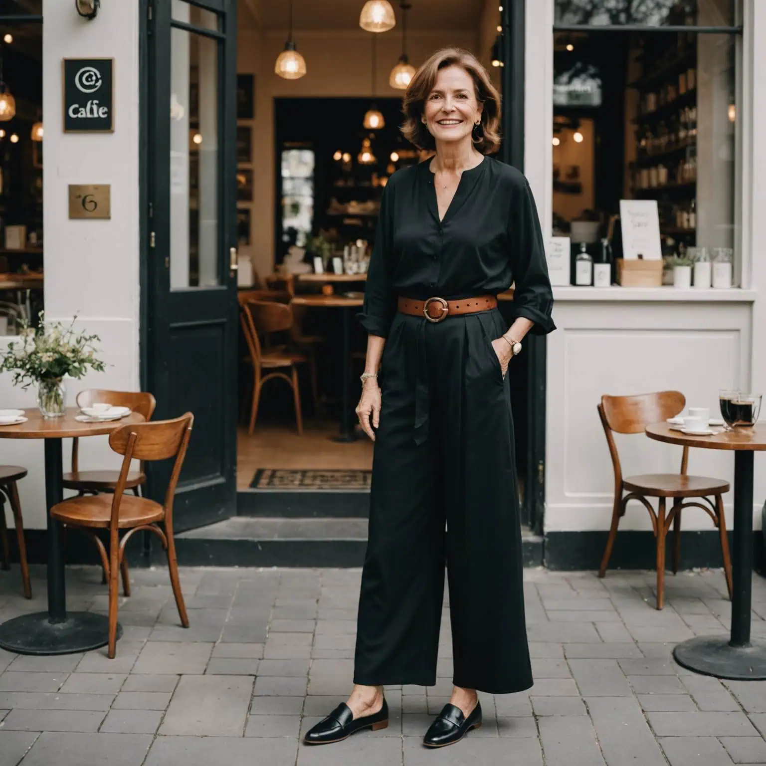 Combining a crisp button-up with fluid full-length pants is a formula for sophisticated minimalism that resonates beautifully at any age. The classic button-up shirt is a wardrobe staple, offering a tailored touch without being overly formal. When tucked into sleek black pants, this combination elongates your silhouette, providing both structure and grace. Adding a belt not only enhances your waistline but also adds a polished finish. Neutral espadrilles ground the outfit, ensuring you stay comfortable while looking refined. This pairing is perfect for both day and evening occasions, meeting the needs of a multifaceted lifestyle.