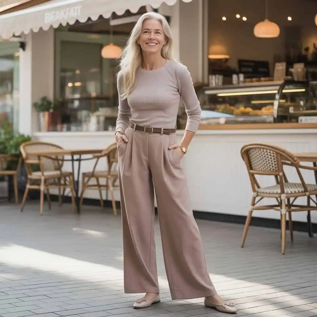 A knit set is your delightfully cozy best friend when it comes to minimalist style, especially for those over 50. This particular combination smoothly marries comfort and elegance, creating an effortlessly polished look. The soft gray oversized knit top adds a layer of tranquility to your ensemble, while the wide-leg pants maintain a sense of flow and freedom. Cinching the waist with a belt introduces structure to the outfit and accentuates your silhouette, promoting a balanced shape. This soft, neutral palette not only radiates sophistication but also allows for the perfect backdrop for your personal flair through accessories. Complementing the entire look with casual slip-ons ensures that comfort never takes a backseat, making this outfit perfect for anything from a casual outing to a cozy gathering. Embrace the cohesiveness of a knit set and let it elevate your minimalist aesthetic with grace and ease.