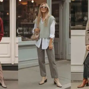 Layering with a sweater vest over a button-down shirt is a simple yet effective way to marry comfort and style. The sweater vest offers warmth without bulk, and its tailored cut provides a flattering shape that defines the waist, while a crisp white button-down adds a classic touch. Pairing this ensemble with khaki tailored trousers introduces a fresh, polished vibe that’s perfect for both casual workdays and brunch with friends. Beige ankle boots serve as a practical yet stylish footwear choice that complements the outfit without overwhelming it. Don’t forget to finish off the look with a leather tote and oversized sunglasses for a dash of glamour.
