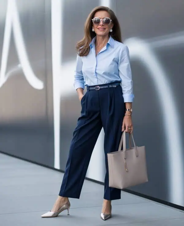 A royal blue V-neck blouse paired with high-rise wide jeans feels nothing short of regal. The deep V-neckline highlights your décolletage, elongating your neck and drawing the eye upward, the bold color brings vibrancy to your outfit, and high-rise wide jeans cinch your waist and flow gracefully.