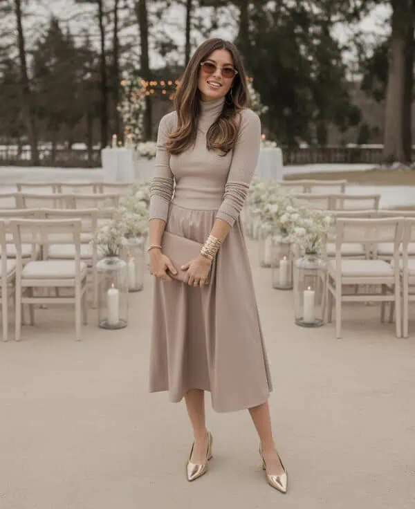 There’s something effortlessly chic about a draped jersey midi dress, especially when it comes with a fabric sash. The taupe shade offers a soft, flattering palette that complements a variety of skin tones while providing a fresh break from more traditional colors. The draping effortlessly creates an hourglass silhouette, subtly accentuating the waist and flowing gracefully over curves. Paired with white sneakers, this look captures a relaxed yet put-together vibe, making it perfect for leisurely outings or casual brunches. The fabric sash adds an element of definition—enabling versatility in styling; it can be knotted, tied, or left flowing for a more laid-back feel.
