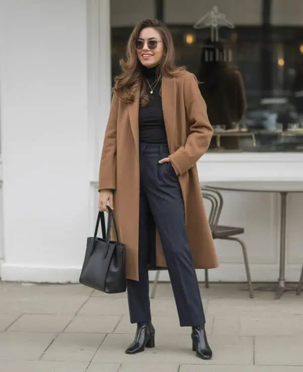 A tailored long camel coat has a structured design that adds balance to your figure – it elongates your form, drawing attention away from areas you may feel conscious about. Plus, the length provides additional coverage for the hips and thighs, which can be incredibly flattering.