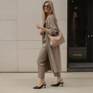 This outfit is all about creating a harmonious, chic palette that feels both polished and cozy. A loose-fitting beige sweater drapes elegantly across the body, offering comfort without compromising on sophistication. Its neutral shade works wonderfully with taupe trousers, which not only provide a sleek silhouette but also play up the warmth of the sweater. The combination of textures adds a slight dimension, creating visual interest while staying refined. A pair of pointed-toe kitten heels introduces an elegant touch while ensuring you’ll stay comfortable all day. Light accessories like pearl studs and a delicate gold necklace complete the look, making it perfect for both casual lunches or gallery visits.