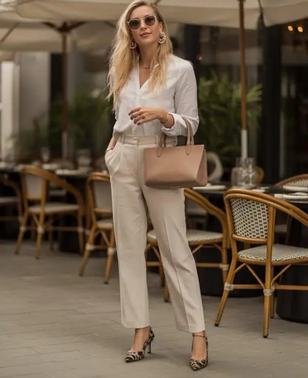 Opting for a cream blazer paired with navy trousers creates a refreshing contrast that feels sophisticated yet approachable. The warm hue of cream brightens your complexion, while navy adds depth and structure—ideal for everyday sophistication. This outfit achieves that effortless chic vibe, perfect for various occasions, from brunch to galleries. Add a simple top underneath to keep things light and breathable, and opt for cream loafers for ease without sacrificing style. The accessories, particularly pearl earrings and a structured bag, elevate the look, effortlessly transitioning it from day to evening while maintaining a polished sense of individuality.