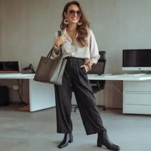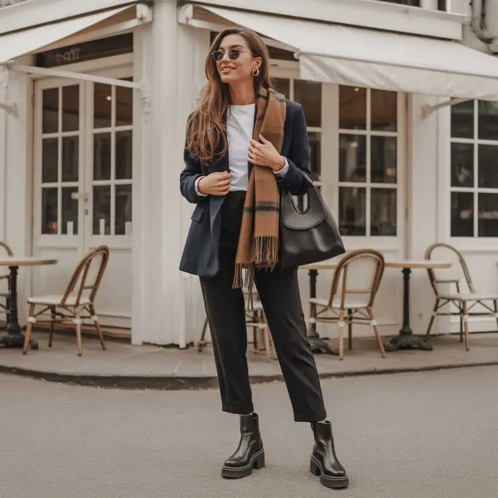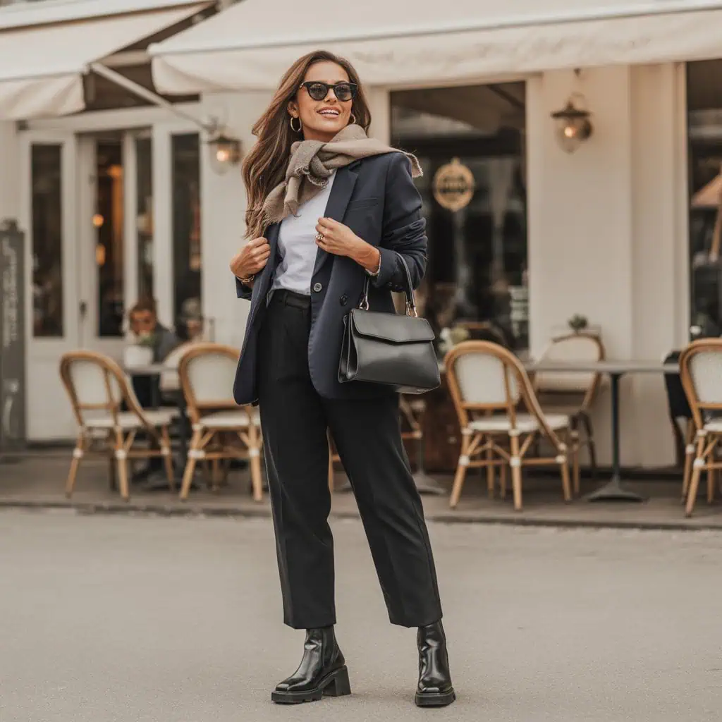 Combining a navy blazer with tailored trousers creates a polished, yet understated, look that’s perfect for any occasion. This classic pairing works because it marries structure with comfort. The rich navy hue is flattering across various skin tones and can easily be dressed up or down. A soft, textured scarf adds an element of coziness while also providing an opportunity for a pop of color or pattern. This outfit allows for creative freedom—consider mixing textures with a cozy knit underneath or indulging in classic accessories such as statement earrings. This balance of refinement and ease captures modern confidence.