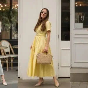 A neutral midi dress embodies the quintessential essence of chic simplicity, making it a must-have for any fashion-savvy traveler. The fitted bodice and flared skirt strike an impeccable balance, accentuating the waist while offering a flowing silhouette that flatters all body types. Slingback heels provide an elegant lift, elongating the leg without compromising comfort. The earthy tones of beige are not only on-trend but also serve as a versatile canvas for accessories; modern sunglasses and a structured handbag perfectly complement the overall aesthetic. This outfit seamlessly transitions from a casual outing to a more refined dinner engagement, epitomizing understated elegance.