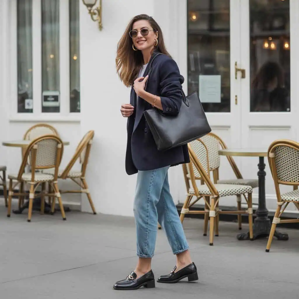 Pairing cigarette jeans with a navy blazer is a masterclass in juxtaposition; the structured yet relaxed elements create a harmonious balance that’s effortlessly chic. The fitted jeans complement the tailored blazer, offering a streamlined silhouette that flatters without sacrificing comfort. Loafers add to this ensemble’s sophistication while ensuring all-day wearability, making them perfect for everything from brunch dates to casual office days. Finish with a structured tote and statement accessories, and you’ll exude that enviable Parisian flair that effortlessly combines elegance with approachability.