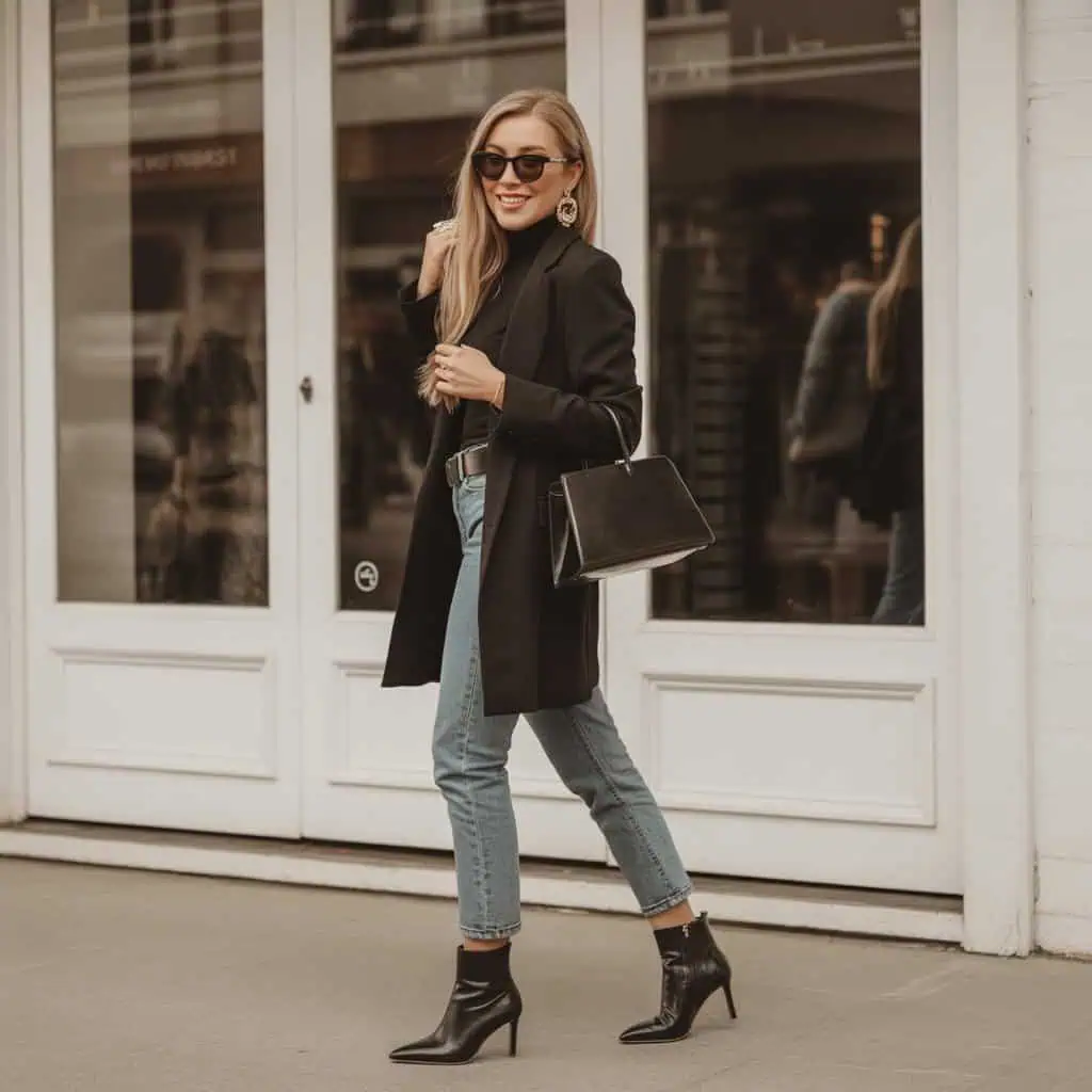 This pairing captures the essence of chic, minimalist elegance. The form-fitting black turtleneck hugs the body beautifully, creating a sleek silhouette that perfectly complements the tailored fit of cigarette jeans. Tucking the turtleneck into your jeans and adding a sleek belt not only defines the waist but also introduces a polished element to the outfit. The contrast of textures between the smooth knit and denim provides visual interest while keeping the look streamlined. Finishing touches like statement earrings and structured accessories amplify the outfit’s sophistication, making it effortlessly versatile for both casual outings and more formal occasions. It’s an ensemble that exudes confidence and an understanding of refined style.