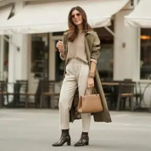 Straight-leg trousers strike an impeccable balance between elegance and comfort, making them a staple in any work wardrobe. The clean lines and tailored fit offer a polished silhouette, effortlessly enhancing your figure, while the neutral hues allow for versatile styling. Pairing them with a classic navy button-up creates a timeless look that exudes professionalism. The pointed-toe nude pumps elongate the legs, adding a dash of sophistication, while oversized sunglasses and delicate gold jewelry keep the vibe modern and chic. This outfit is not just about looking good; it’s also about feeling empowered and ready to tackle the workday with confidence.