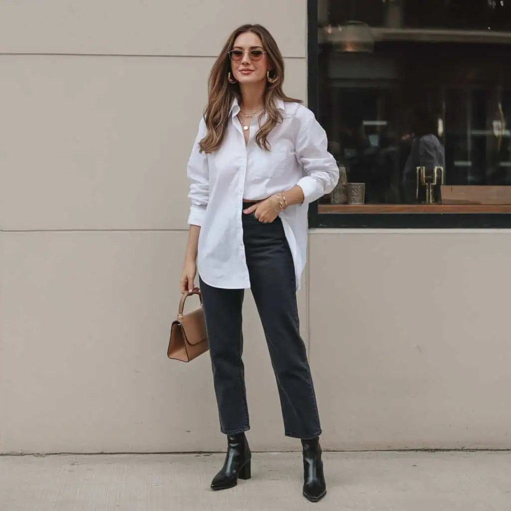Embracing the chic simplicity of clean dark-wash straight jeans allows you to craft a look that feels polished yet effortlessly casual. The rich hue of the denim creates a sophisticated foundation, while the structured silhouette flatters your figure without compromising comfort. Pairing these jeans with a crisp white oversized button-up elevates the ensemble, adding a fresh contrast that brightens your whole appearance. Accessorizing with gold hoops and oversized sunglasses adds a touch of glam, perfect for making a statement. The chic black heeled ankle boots ground the outfit, creating a refined connection from head to toe. It’s a look that stands out while still exuding an air of ease.