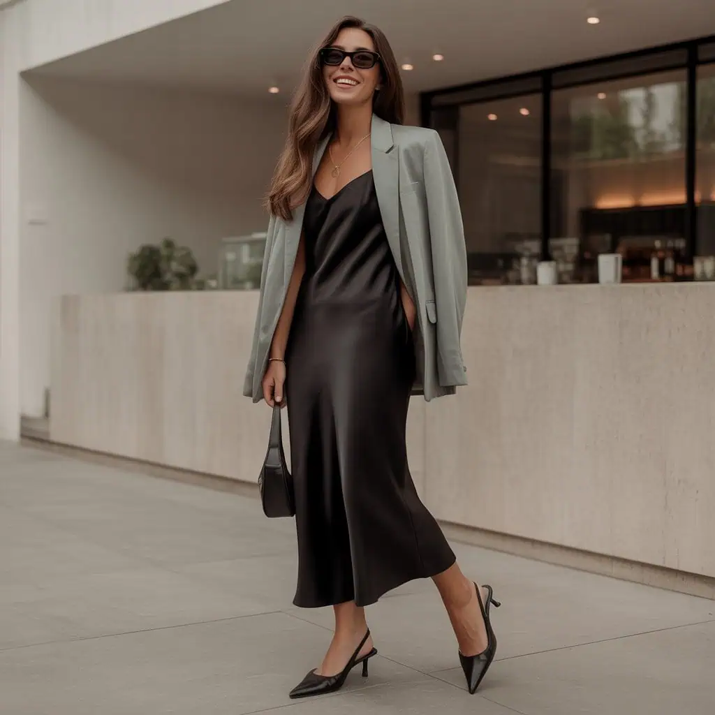 The beauty of a slip dress lies in its versatility—it effortlessly balances elegance and comfort, making it a staple for any wardrobe. By layering it with a light blazer, you elevate the outfit while maintaining a casual aesthetic. The contrast between the silky slip and the structured blazer creates visual interest, adding an element of sophistication. Accessorizing with minimal silver jewelry and oversized black sunglasses keeps the look modern and chic. Black slingbacks add a subtle touch of glamour, making this pairing perfect for day-to-night transitions. You’ll feel as though you’ve just stepped out of an editorial shoot, radiating confidence and poise while showcasing your effortless style.