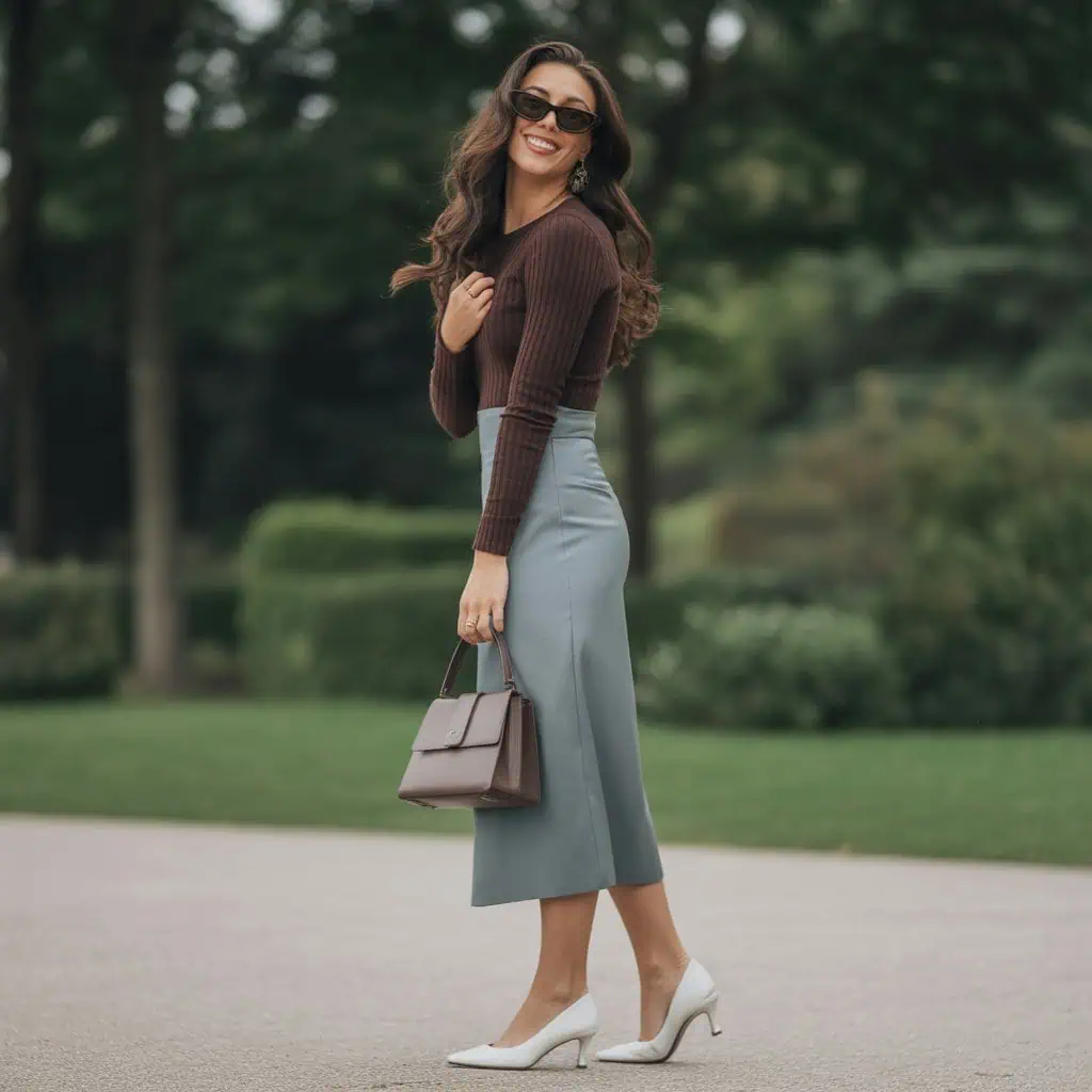 The delightful pairing of a cozy chocolate knit sweater with a tailored slate pencil skirt strikes a perfect balance between comfort and chic. The rich texture of the knit adds a laid-back vibe, while the fitted skirt brings structure, creating a beautifully balanced silhouette. Tucking the sweater into the skirt enhances your waistline, adding definition to your figure. Meanwhile, classic ballet flats keep the look effortlessly chic and allow for easy movement. Complete the ensemble with structured accessories in neutral tones for a polished finish that’s perfect for cozying up with a good book or enjoying a casual brunch with friends.