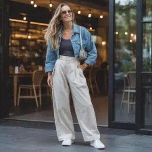 Pairing a structured slate blazer with chocolate trousers creates a striking balance between sophistication and warmth. The cool tones of slate beautifully complement the rich, earthy chocolate hue, making this outfit stand out without resorting to typical black. By tucking a fitted top into the trousers, you define your waist, enhancing your silhouette. The sleek pointed-toe heels inject an element of chic elegance, while oversized sunglasses elevate the look to glamorous heights. Whether you’re heading to a meeting or a stylish brunch, this combination exudes confidence and refined taste.