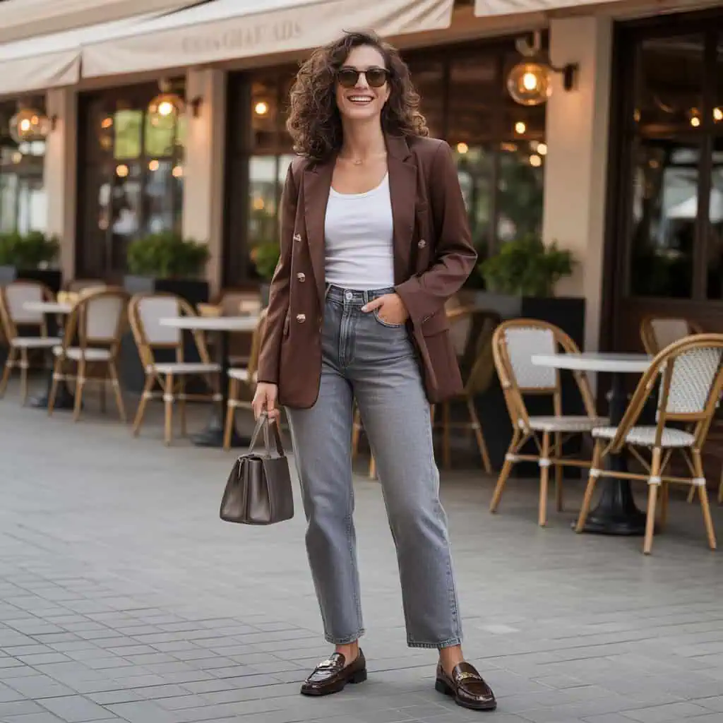 There’s something effortlessly chic about the combination of a chocolate blazer and grey jeans—it strikes the perfect balance between polished and casual. The deep, rich tones of the blazer bring warmth and sophistication, while the classic grey jeans provide a laid-back vibe that can easily transition from day to night. This pairing allows for a play on texture; smooth fabrics like the blazer contrast beautifully with the denim. Elevate the outfit with polished loafers for a touch of elegance, and utilize oversized sunglasses and a structured handbag to enhance that editorial flair. This combination not only enhances your silhouette but also showcases your fashion-forward approach.