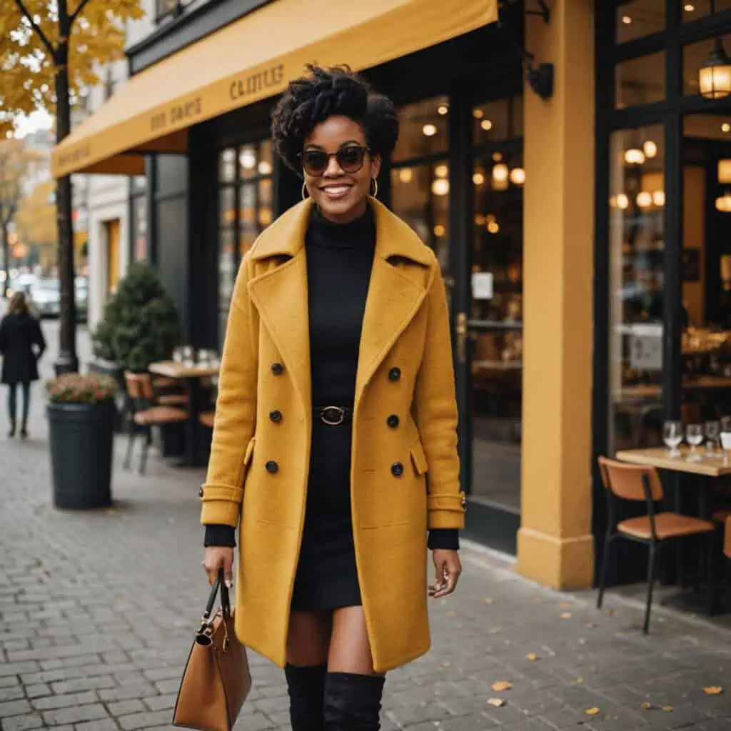 Mustard yellow is among the colors of fall, and there’s no better way to embrace it than with a wool coat in such a warm hue. The shade instantly brightens your complexion and adds warmth to your outfit, while the tailored cut flatters your figure, giving you a sharp profile.