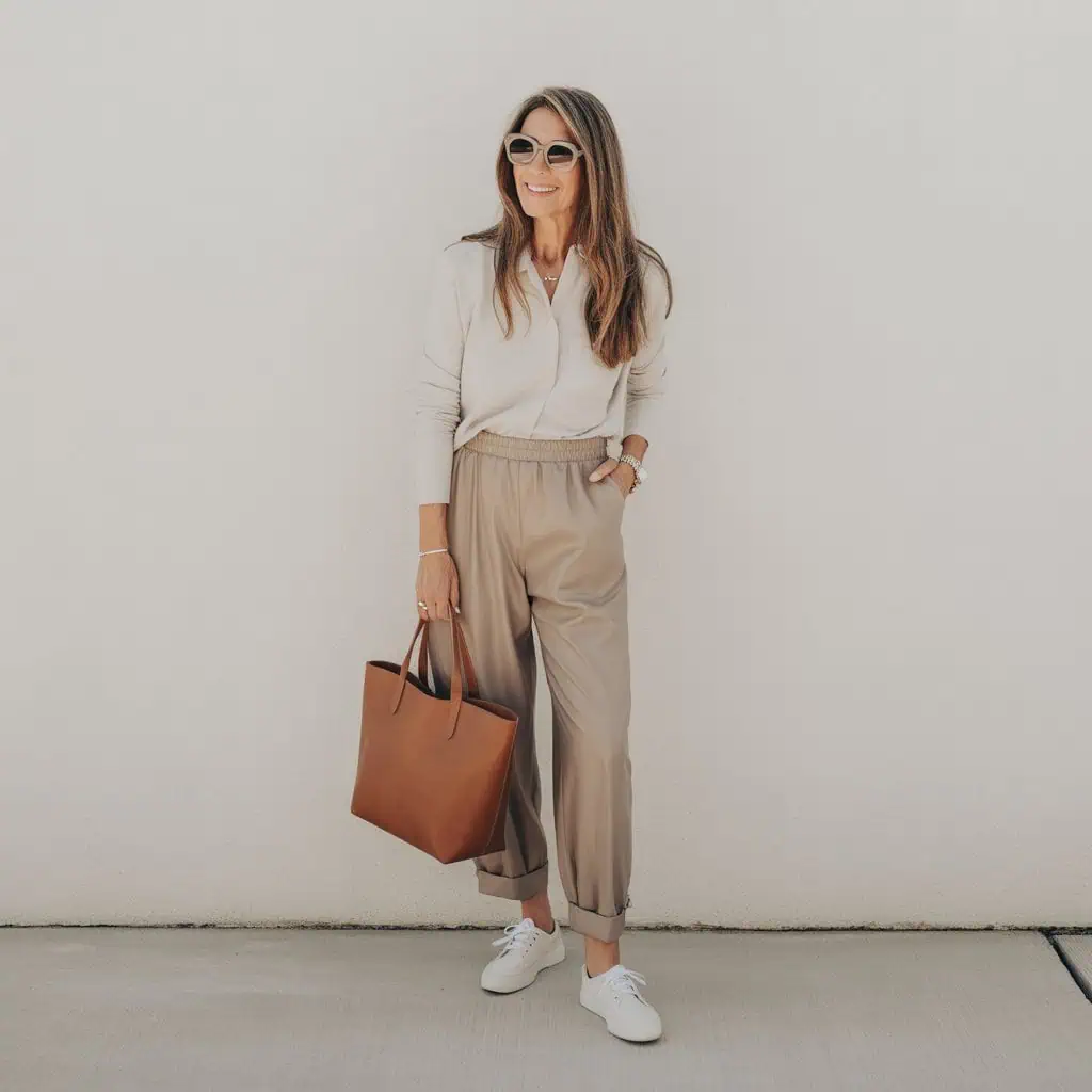 While comfort is important, wearing elastic waist trousers that lack structure can inadvertently lead to a frumpy appearance. To keep your look polished, consider trousers that have tailored cuts with a touch of elasticity for movement. A pair with a slightly tapered leg or a paper-bag waist is not only comfortable but can create a more sophisticated shape. Pair them with a fitted top that can be tucked in to emphasize your waist and elongate your proportions. A classic cream shirt adds versatility, and when combined with sleek accessories like a structured tote, it can elevate the overall look, ensuring you radiate confidence and style.