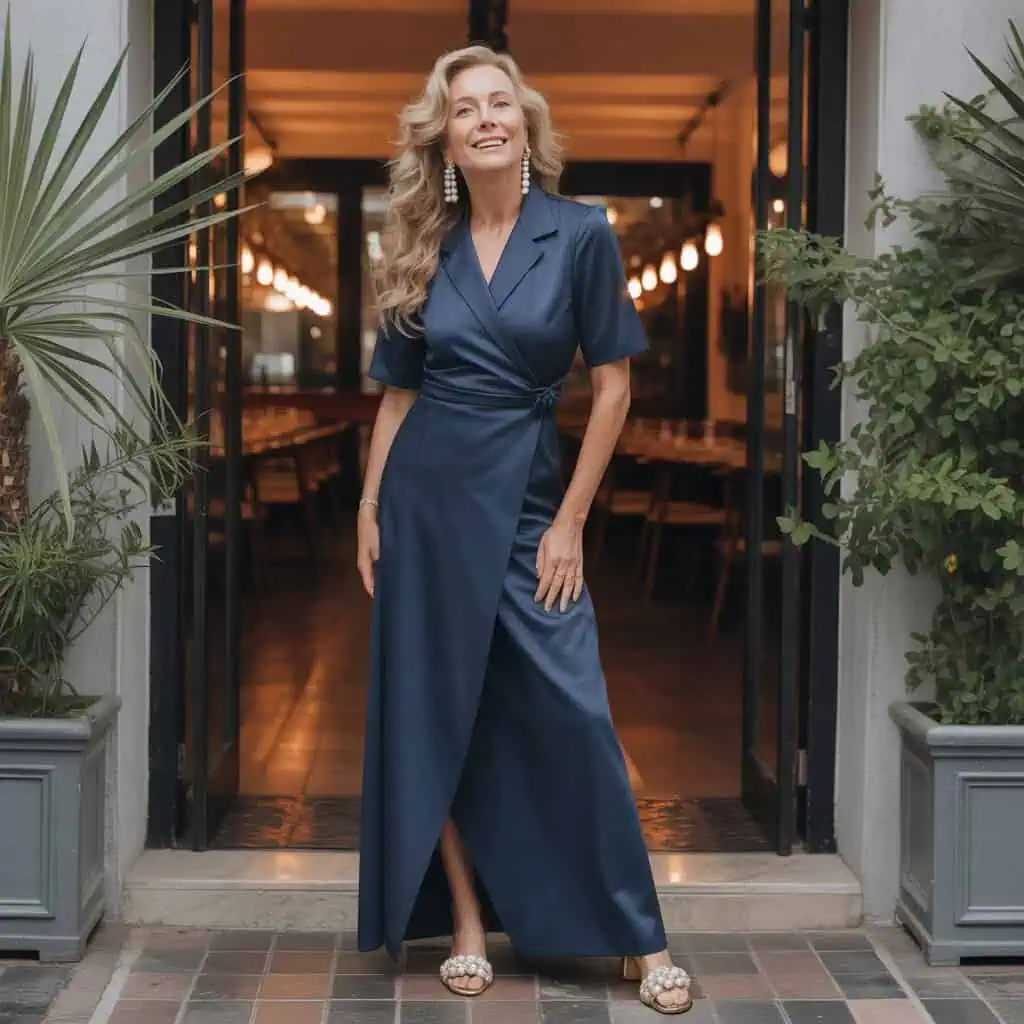 A structured wrap maxi dress is an absolute showstopper, particularly in a bold solid color. The wrap design emphasizes the waist while offering a flattering silhouette, making it perfect for women over 50 who wish to highlight their curves. This dress is both functional and fashionable—easy to slip on and stunning enough for formal occasions. To elevate the outfit, pearl drop earrings add a classic touch of sophistication that complements the dress beautifully. These pearls bounce light and add a subtle glow, making them perfect for outdoor summer weddings. Together, these elements create an effortlessly chic appearance that celebrates your personal style.