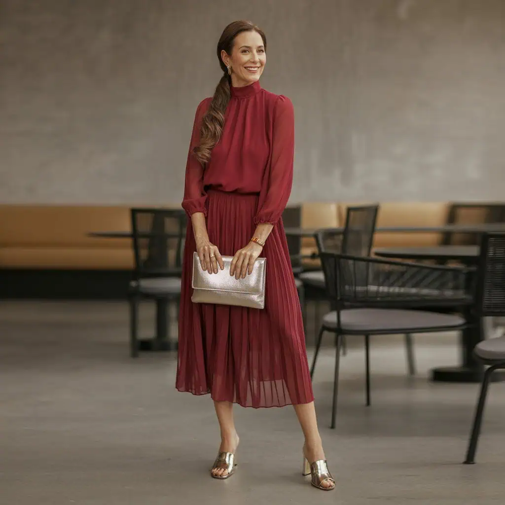 A high-neck chiffon midi dress in a striking cherry red is an eye-catching choice, combining modern design with timeless appeal. The high neckline provides a sophisticated touch that balances beautifully with the flowing fabric of chiffon, which moves gracefully with each step. This airy material is ideal for warm summer days while keeping you feeling polished. Pairing it with a metallic clutch elevates the look to new heights; the metallic tone adds a contemporary flair without competing with the dress. This combination radiates confidence and sophistication, making it the perfect ensemble for dancing the night away at a wedding.