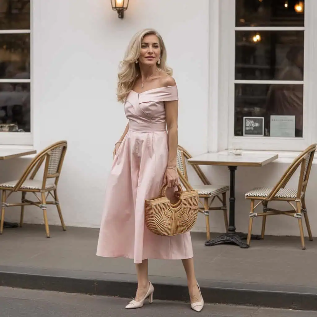 Looking for an outfit that exudes confidence and charm? An off-the-shoulder midi dress in a striking solid color highlights your neckline beautifully and adds a touch of allure without being over the top. This style draws attention to your facial features while allowing for a breezy and comfortable fit—perfect for summer festivities. Complementing the look with raffia accessories like a bag infuses a textured, artistic element that enhances your overall aesthetic. Heels maintain harmony with the soft feel of the dress while offering a chic touch. This outfit not only celebrates your femininity but also captures the joyful essence of a summer wedding.