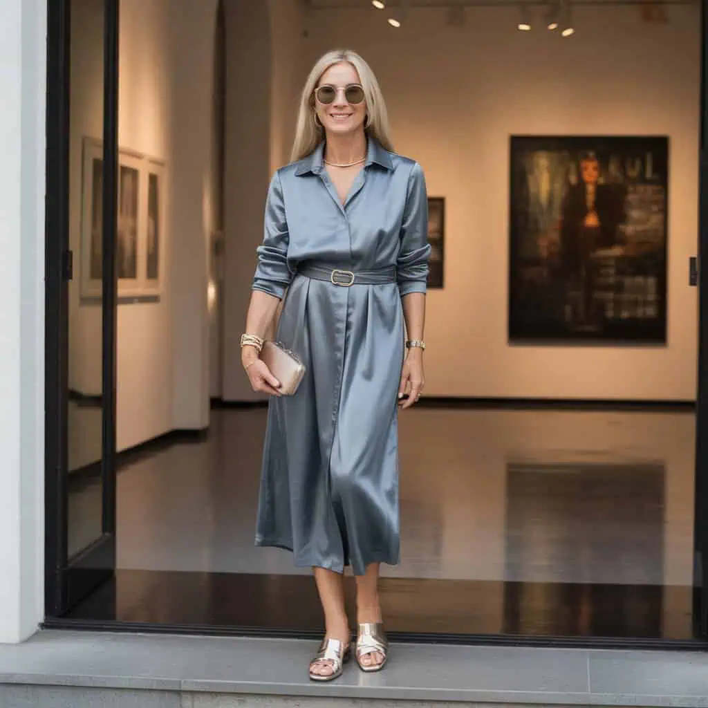 10. Belted Shirt Dress in Satin-Crepe with Minimalist Gold Jewelry