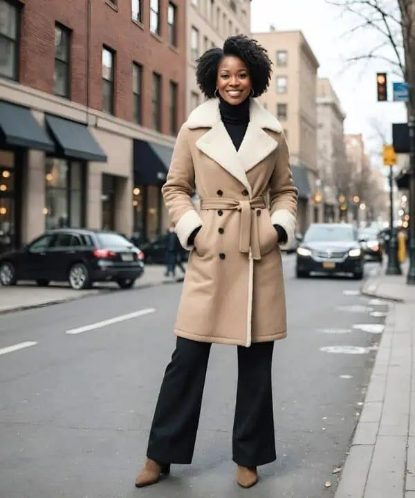 For those days when you want to feel warm and cocooned, a light shearling coat is just the thing – it keeps you snug and comfortable, making every outing feel like a cozy escape. It’s cozy yet effortlessly stylish, adding a hint of texture with its soft, inviting collar and lining.