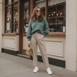 Icy lavender is often an overlooked color in women’s fashion over 40, but it can be incredibly flattering when styled correctly. This fitted turtleneck sweater creates a sleek look that complements the body’s natural lines while also bringing a touch of softness and warmth. Pairing it with tailored trousers balances out the femininity, giving the whole outfit a professional edge that remains stylish. The taupe leather ankle boots ground the look and enhance leg length, a fantastic choice for any shape. Accessories like oversized sunglasses and a structured grey handbag not only add a chic factor but keep the color’s icy tone from feeling too muted, making it an Instagram-worthy standout.