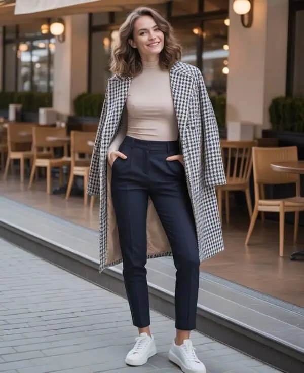 Black structured jeans are a timeless essential, offering versatility and instant sophistication. They pair wonderfully with more tailored pieces, creating a sleek aesthetic ideal for any occasion. A fitted grey wool turtleneck tucked into wide-leg jeans emphasizes your shape, giving a well-groomed appearance that perfectly balances comfort and style. The double-breasted black pea coat adds a polished layer, while black heeled Chelsea boots provide just the right amount of height. Statement gold earrings serve as eye-catching accents, drawing attention to your face and making a striking impact. This outfit proves that ageless style is not only about age but also about confidence and the way you carry yourself.