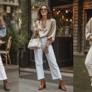 White or ecru jeans can be a game-changer for any wardrobe, especially as we embrace our style after 40. Their light tones serve as a perfect canvas, allowing layered textures and accessories to shine. Picture yourself in a cream knit sweater—it’s cozy yet chic when tucked into ecru jeans, creating an elongated silhouette. The structured beige trench coat adds an element of sophistication, while beige leather ankle boots keep the vibe effortlessly stylish. Don’t forget those layered gold necklaces; they catch the light beautifully and add a touch of elegance. Oversized sunglasses not only provide chic sophistication but also shield your eyes while you’re out and about, reminding you to embrace every moment with a smile.